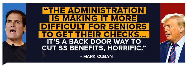 | YES! Mark Cuban EXPOSED Trump: He just BLASTED Trump for his terrifying attempts to cut to Social Security ↘↘↘ ![]() Mark Cuban is SO RIGHT. We couldn't stand back and do nothing, so we're going all-in to raise $90,000 by midnight in honor of Social Security's 90th Anniversary. If we hit our goal this week, we'll have the resources we need to SAVE Social Security. Donate $5 now to help rescue Social Security from Donald Trump >> Here is everything you need to know today: