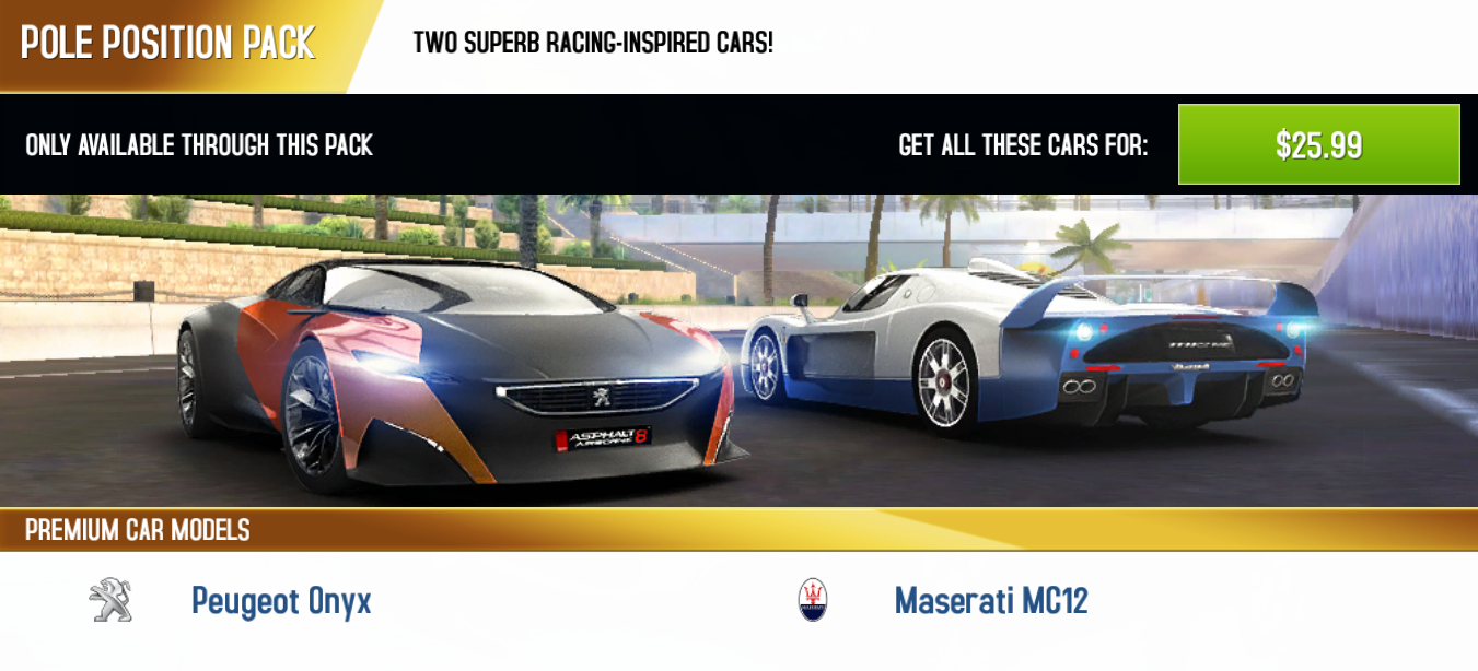 For 99.99 USD, you can get 3 000 000 credit. For almost double the price of a new PC game, you can get these credits. In this particular game, I estimate one have to play ~6-24 hours constantly to get this amount of credit. But by playing ~6 hours, I mean 6 hours without progress in the game! Kind of boring. And what do you get from 3 000 000 credit? You can buy one of the most expensive cars, but can't tune them fully. You have to play more (without progress) or buy more. But guess what, there are more cars you can't buy by only playing the game. Those are only available via in-app-purchase.