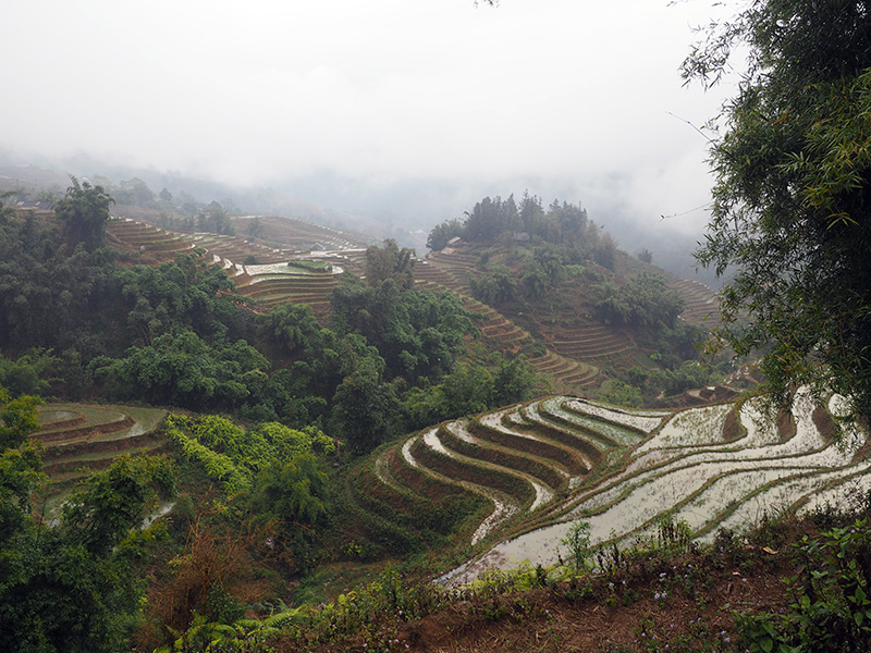 El segundo día lo íbamos a dedicar por entero a hacer uno de los trekkings más clásicos de Sapa, el que lleva a las aldeas de Lao Chai y Ta Van. Sapa se encuentra encaramada en un collado que domina el valle de Muong Hoa, lleno de arrozales y de aldeas de diferentes minorías étnicas. El valle está recorrido por una red de caminos en los que es fácil perderse, así que se recomienda llevar un guía, preferiblemente de una minoría étnica para contribuir a la economía local. En nuestro caso contratamos el guía a través de nuestro alojamiento, y nos costó 29 USD por persona, lo cual incluía la comida y el transporte en taxi de vuelta desde Ta Van. Sobre las 9 de la mañana nos vino a buscar nuestra guía, Nini, una chica hmong de 26 años con un inglés excelente. Mientras iniciamos el trekking nos explicó un poco de su vida y de las tradiciones de los hmong. El día había amanecido nuevamente con niebla, pero según bajábamos valle abajo se fue aclarando un poco. Al principio se unió a nosotros una amiga de Nini, que parecía que hacía el mismo camino. Antes de llegar a Cat Cat, nos salimos de la carretera y empezamos a caminar por un estrecho sendero. Éste era muy empinado y embarrado, y nos costó lo nuestro ir bajando manteniendo la verticalidad. Nini y su amiga no parecían tener nuestras dificultades, y eso que calzaban unas sencillas botas de agua. Menos mal que nos improvisaron unos bastones con unos bambús, sino nos hubiéramos caído mas de una vez. Conforme bajábamos más, las vistas eran mejores y pudimos disfrutar de los preciosos paisajes llenos de arrozales. Como estábamos en diciembre, el arroz lo habían plantado hacía poco y no estaba todo lo verde y bonito que podría. Pero lo que nos dejaba ver la niebla nos gustó.