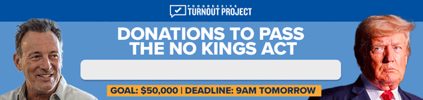 She’s absolutely right! Trump thinks he’s a KING… but Democrats have a brilliant plan to stop him: PASS the No Kings Act! But we still need another 829 donations today. Remember: All gifts are 300%-MATCHED to Progressive Turnout Project to help elect Democrats who will pass this bill. Please, can you chip in $5 or ANYTHING now?
