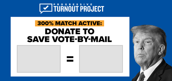 THANKFULLY, top-donors have activated a 300%-match on all donations to save Vote-by-Mail until midnight! Please, DON’T WAIT for your freedoms to be stripped away, rush $5 or anything you can afford before our midnight deadline to SAVE Vote-by-Mail, TOPPLE the MAGA Majority, and TAKE BACK THE HOUSE (DONATIONS 300% MATCHED) >>